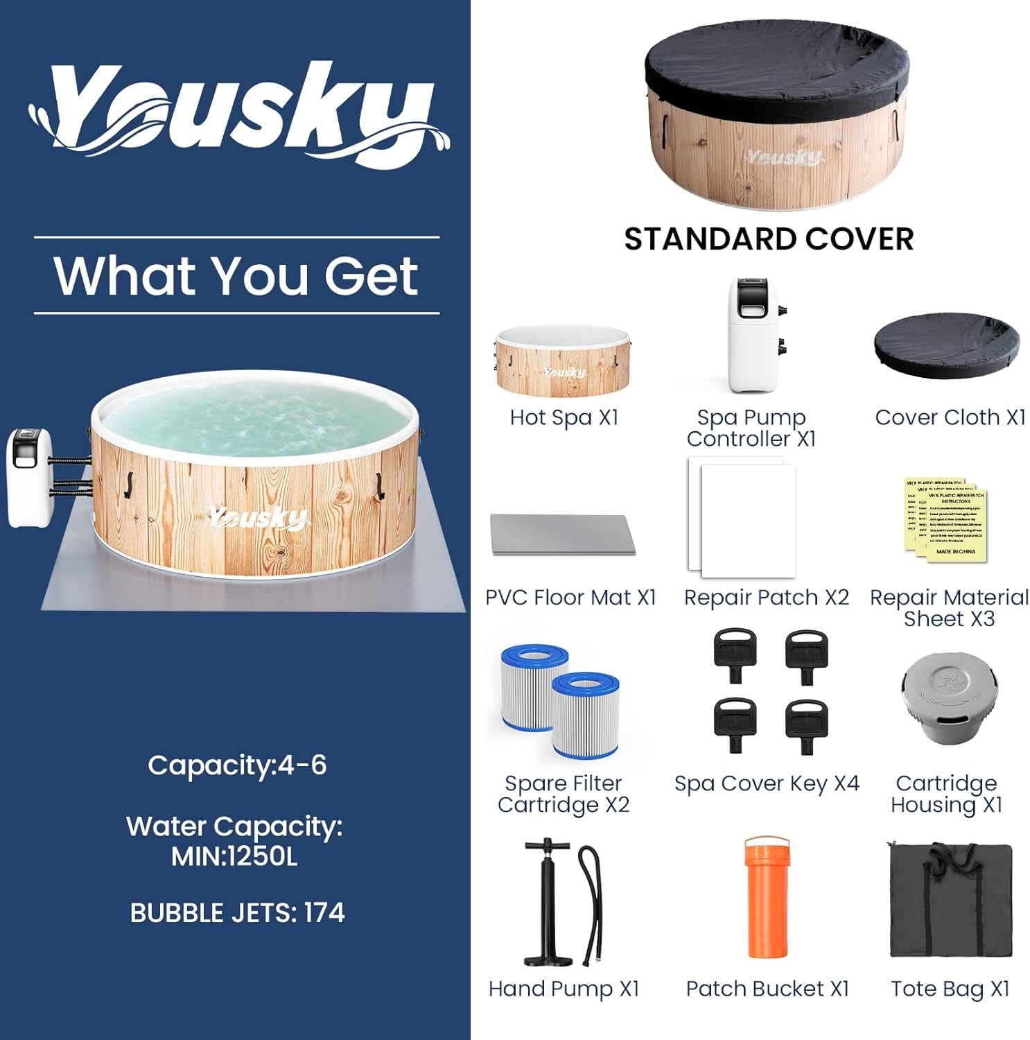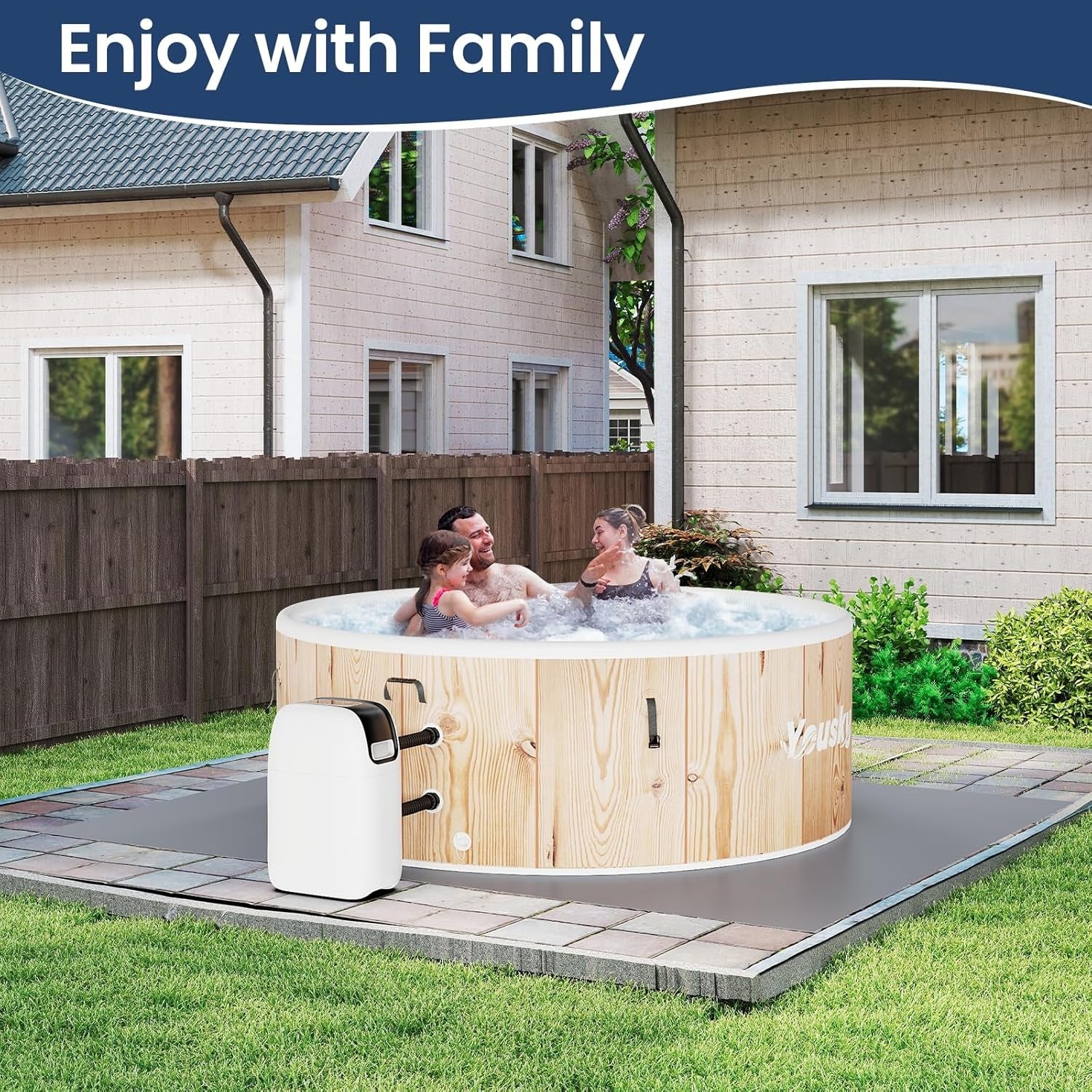 - Stylish Wood Grain Design & Convenient Features: The natural wood grain design adds a touch of elegance to your hot tub, seamlessly blending with your outdoor decor. The easy-to-use control panel allows for effortless operation, while the removable lockable cover keeps your spa clean when not in use. A ground mat protects the tub from wear, and the included storage bag keeps everything neatly organized for hassle-free maintenance.