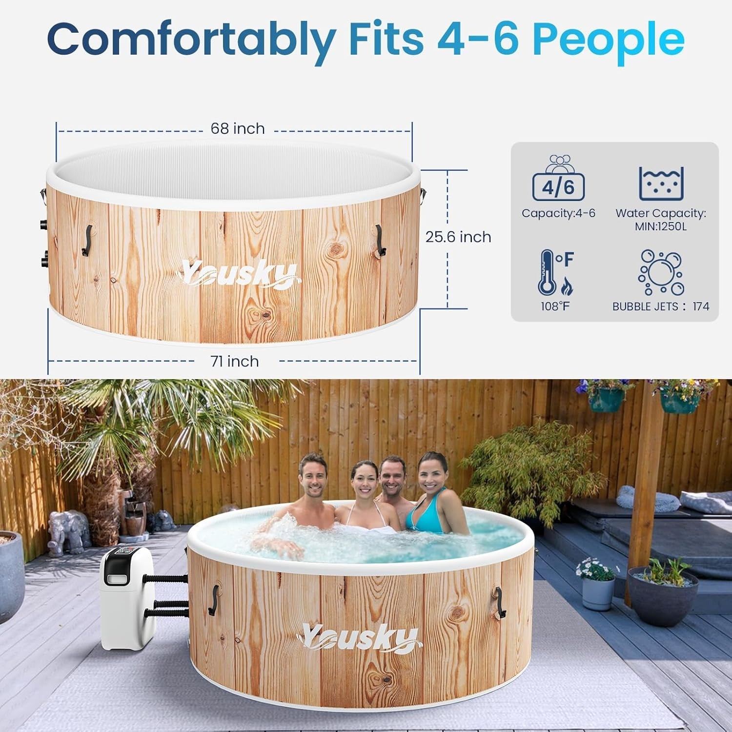 - Spacious & Comfortable for 4-6 People + Efficient Heating & Filtration: With 71"L x 71"W x 26"H dimensions, this inflatable hot tub comfortably fits 4-6 people, making it perfect for family or group relaxation. The heating system warms water up to 42°C for ultimate comfort, while the filtration system with two replaceable filters ensures your water stays clean and fresh.